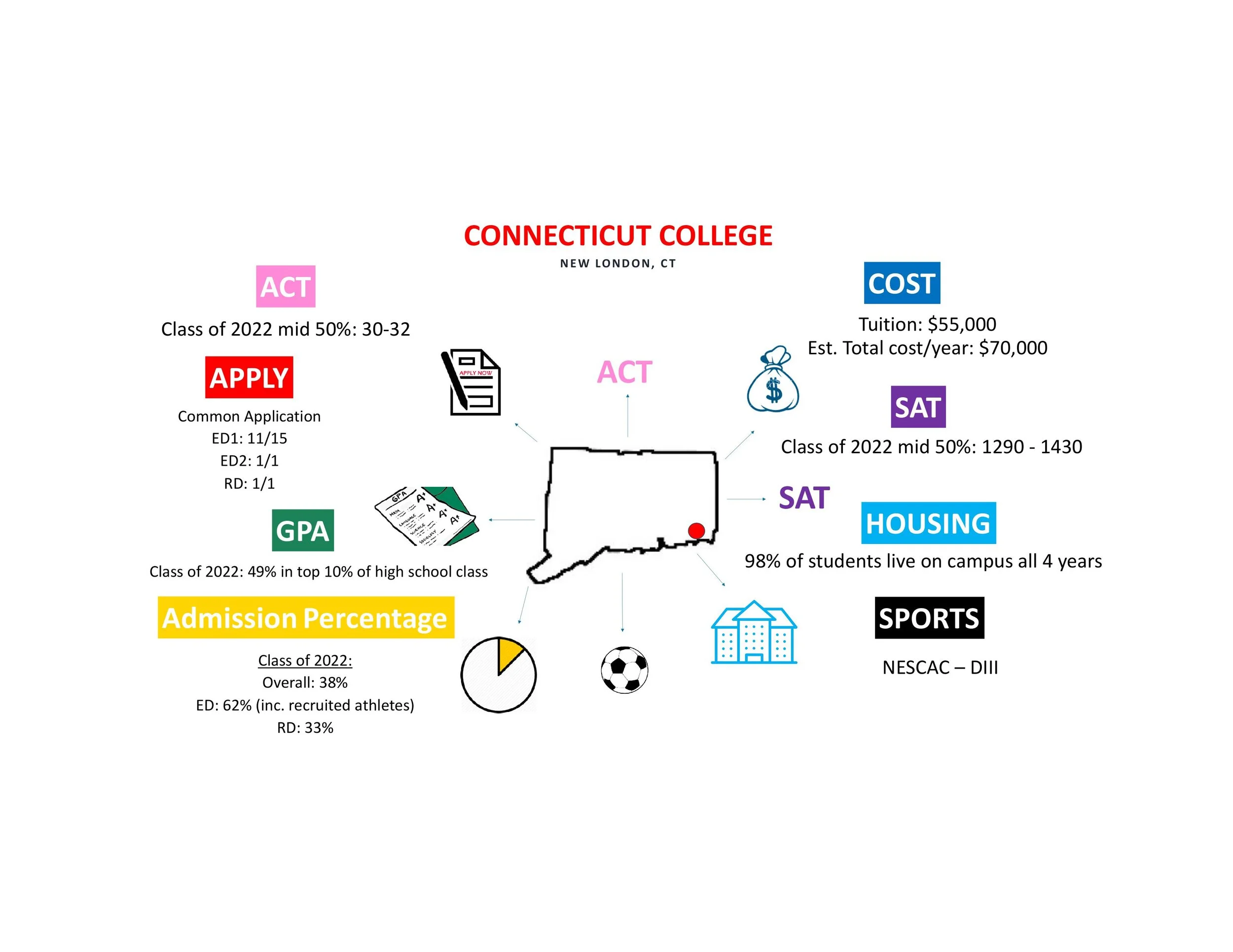 Connecticut College is a competitive and highly selective small liberal arts college located in New London, CT. The campus has beautiful grounds with a large open green space used for athletic events and general student use. Many of the housing options are located along the green. The college was founded as the first all woman’s college in CT. Although it is now coeducational, the ratio of women to men is about 60:40.